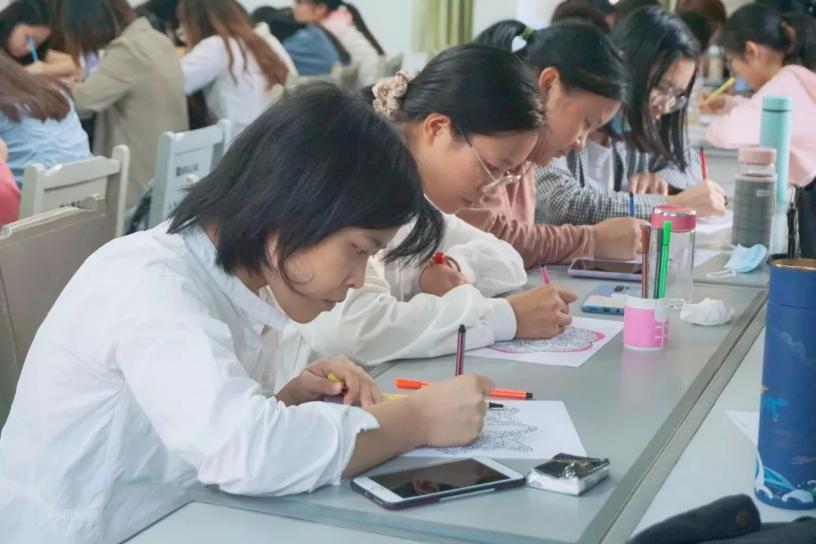 叶老师将每10个同学分为一组,每个人选择自己觉得舒服的颜色为家庭曼陀罗涂色。涂色要求表达自己对于家庭的感受和印象。在这个过程中,关于家庭的记忆片段可能会自然浮现在你的脑海。同学们逐渐融入到这个环节中,手上的画纸也有了不一样的色彩。