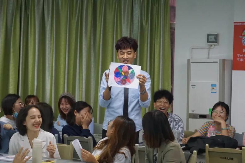 在涂色环节结束后,叶老师让同学们观察自己的作品,并在脑海中回想自己的家庭。之后进行了小组分享和班级分享,心理辅导员到每个组进行分析指导。20级汉硕的同学们和大家分享了自己的家庭,让大家感受到了家庭的温馨,也看到了他们对家庭的态度和看法。