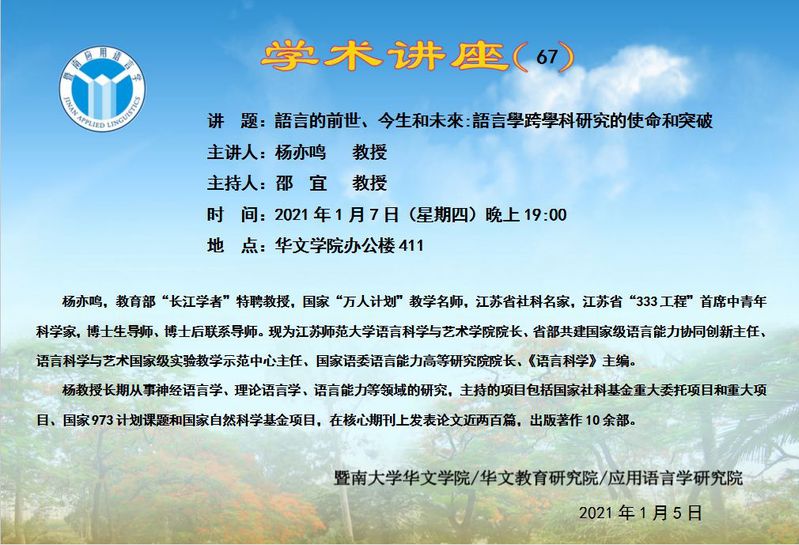 杨亦鸣教授学术讲座:語言的前世、今生和未來:語言學跨學科研究的使命和突破