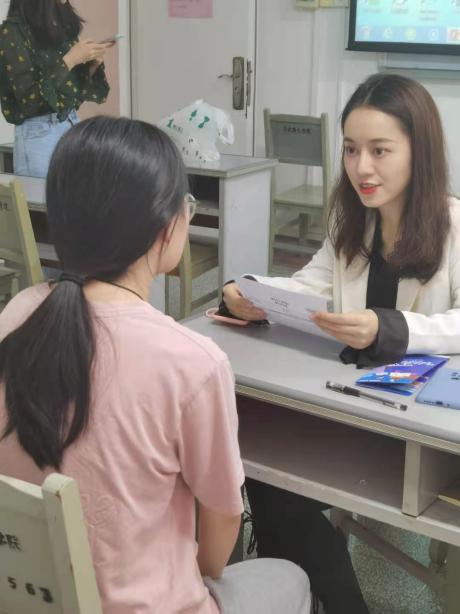 在新东方老师们与同学一对一沟通的同时,主讲人魏老师也通过与教育企业机构的横向对比展示了新东方教育集团在大湾区教育领域突出的优势与成就,进一步吸引学生们的求职兴趣。沟通的老师询问了有意向学生对各学科的倾向,并通过分析学生们的简历给出相关工作方面的建议。