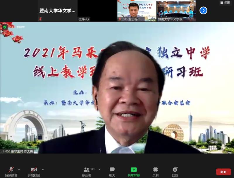 马来西亚董总陈大锦主席在致辞中对研习班主办方和承办方表示感谢,并简要介绍当前疫情下马来西亚华文教学情况。他说,网络技术在未来教学模式中的作用将更加突出,而本次研习班的教学内容正契合网络时代教育新常态下对教师教学能力的要求,感谢各位教师在忙碌工作之余抽出时间精进教学能力,祝愿学有所成。