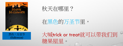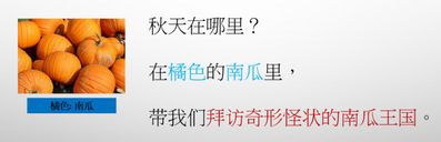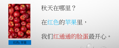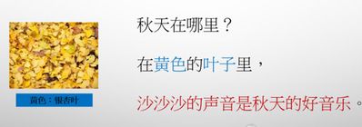 在学过《收藏秋天》一文后,简安志带领学生(9岁)走出课堂,到户外感受秋天并收集树叶。然后将学生分组进行讨论汇报,老师根据学生汇报写下目标句型让学生回答,答案就变成绘本的一部分。最后,简安志跟家长们一起带着学生制作“树叶”贴画,完成属于学生自己的贴画绘本书,让学生们既加深对秋天的感知又学会用汉语来表达秋天丰富多彩的色彩。