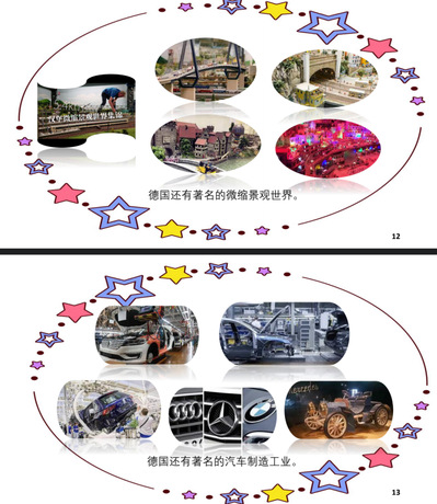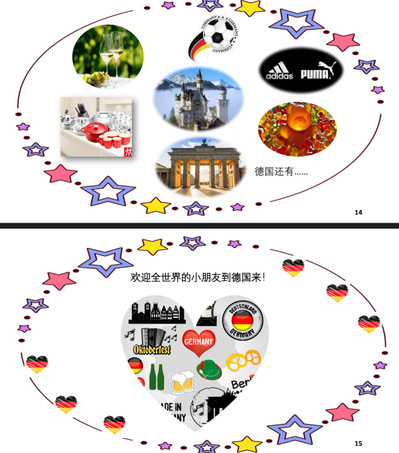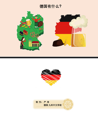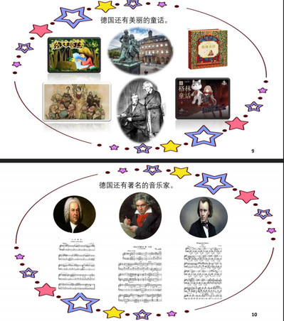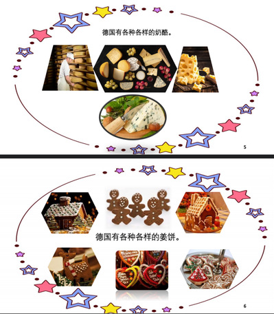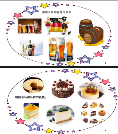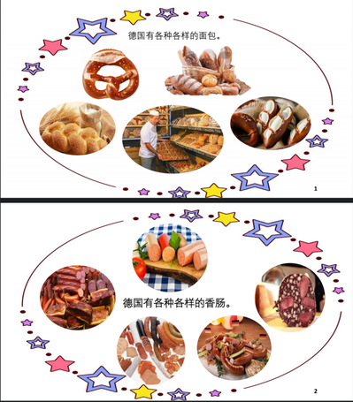 在绘本制作过程中,严萍遵循老师们讲述的教材编写原则,绘本创编理念、架构与流程,借鉴经典绘本语言层面和绘图配色等方面的设计,采用散点集中模式进行创编。她的绘本立足德国本土文化,通过德国儿童在日常生活中常见的事物,配上精美鲜艳的图片,将大量“可懂输入”以形象生动的方式展示,符合儿童的认知特点,让孩子们学会用汉语字词句来介绍德国;高频词语和句式多次复现,将“德国有各种各样的……”这一句式融入图画中,让孩子们有不断扩展和替换的乐趣。