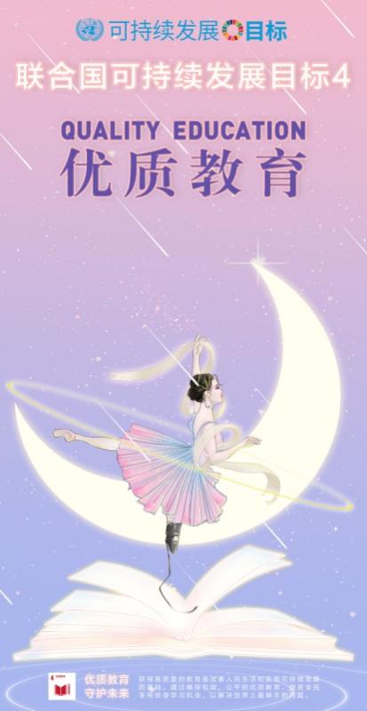 海报设计中,佩戴义肢的纤细少女在皎洁月光下翩翩起舞,挥舞的彩带仿若地球的赤道,女孩的脚下是一本徐徐展开的书籍,象征无论性别、种族、年龄、贫富,地球村上的所有人都能获得包容、公平的优质教育,实现“有教无类”的人类理想,展现了华文学子的广阔视野和胸怀。