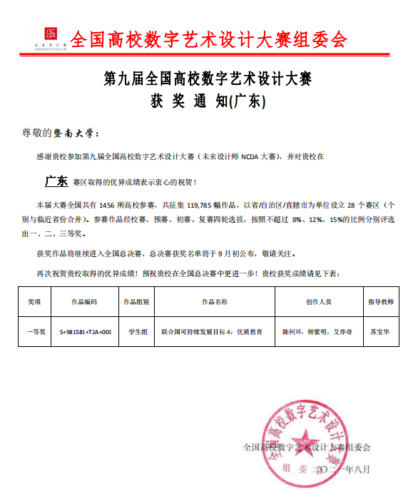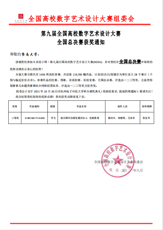 2021年8月31日,第九届全国高校数字艺术设计大赛落下帷幕。我院应用语言学系本科学生陈柯环、柳紫明、艾亦奇同学参加的T2公益赛道作品——《联合国可持续发展目标4:优质教育》以广东省赛区一等奖的好成绩晋级全国总决赛,并获得了全国三等奖的名次,指导老师为苏宝华副教授。