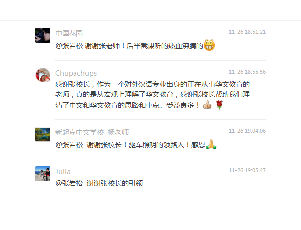 六位老师的精彩讲解让学员们纷纷表示收获颇多,从教育理念、教师素养、语言习得心理特征、课程革新到华语研究、华语传承口述史、文化教学,六位老师毫无保留地分享自己的经验和方法,实用有效,精彩绝伦,获得学员们的一致好评。学员们对本次海外华文教师“华文教育研究”研修班的课程设置和讲授均予以了较高评价,认为本课程有助于全球华文教师的交流和进步。学员们表示非常期待后续的课程,共享“华文教育研究”的学术盛宴。