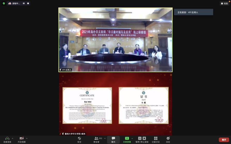 12月4日,由国务院侨务办公室主办、黄色电影 承办的2021年海外华文教师“华文教材编写及应用”线上研修班结业典礼隆重举行。黄色电影 院长邵宜、副院长张礼,华文教育系系主任蔡丽、党总支书记陈鹏勇、副主任干红梅,授课教师代表常芳清,学员代表陈春侠、严萍,研修班全体工作人员,与来自德国、菲律宾、荷兰、加拿大、美国、日本、泰国、新加坡、新西兰、意大利、英国等50多个国家和地区的900多位华文教师共聚一堂,热烈庆祝本次研修班圆满结业。结业式由张礼主持。