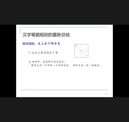 笔顺问题是美欧华裔学生学习中文的主要障碍。笔顺不只是笔画书写的顺序,更是安排部件的顺序,宜采取先排部件,再写各部件的内部笔画的方式。根本规则为“左上右下两步走”——从左上角写到右下角;按照部件、笔划两个层次进行,整字之间部件依次书写,部件之内笔画依次书写。