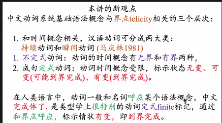 另外,无变事件不蕴含到界之义,与持续动词不定式语义一致,持续动词成句无需限定;有变事件蕴含到界之义,动词成句必须有限定性体记表示时间到界的体貌观。