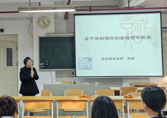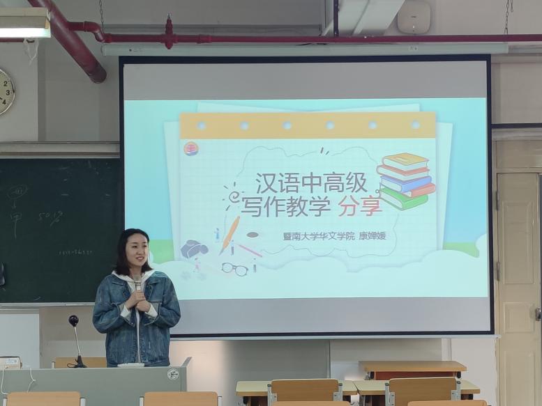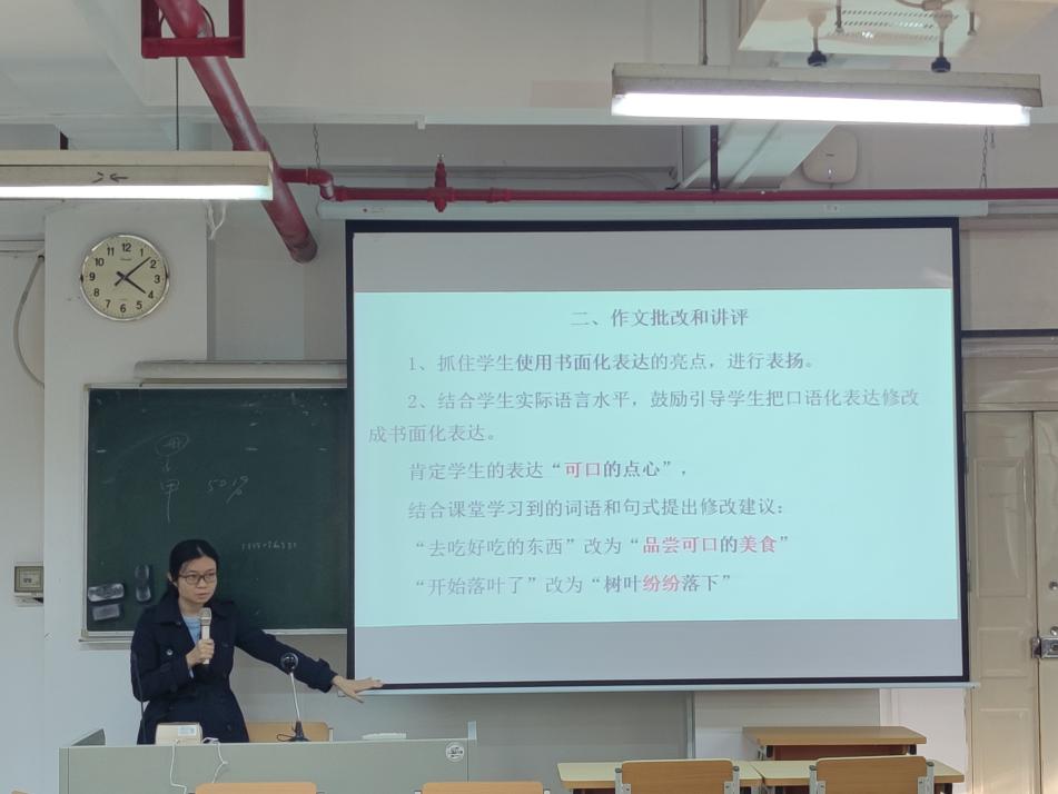 会议下半场,汉语系教师李宁、王意颖、康婵媛,应用语言学系教师王晶分享了他们在不同课型的写作教学环节经验。李宁围绕商贸汉语课程中的写作环节教学介绍了为留学生分类定制写作模板、结合调查实践设计写作题目的方法;王意颖分享了汉语精读课教学过程中,引导学生完成口语向书面语转换的具体教学案例;康婵媛主要分享应用写作教学中,能够更快激发学生写作兴趣、提高课堂交互性、改变枯燥沉闷课堂氛围的课程设计;王晶则基于活动理论,简要说明如何利用语言学习的活动系统,将写作课教学的知识性内容与学生思维培养结合起来。