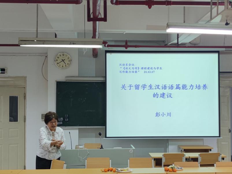 最后,汉语系特邀专家彭小川教授以“语篇能力培养”为主题对留学生写作教学提出了建议和对策。她指出语篇的衔接对于成段表达来说非常重要。留学生写作能力不足经常表现为他们话语的衔接照应和连贯不佳。解决这个问题,从纵向的阶段性看,不要跨难度训练,要在学生培养语感的同时,加强对话语衔接练习;横向上看,必须强调语篇教学的整体性,鼓励学生进行成段表达。因此,写作能力的提高并不只是写作课老师的任务,而是在于教学整体各环节之间分工配合,互相促进。