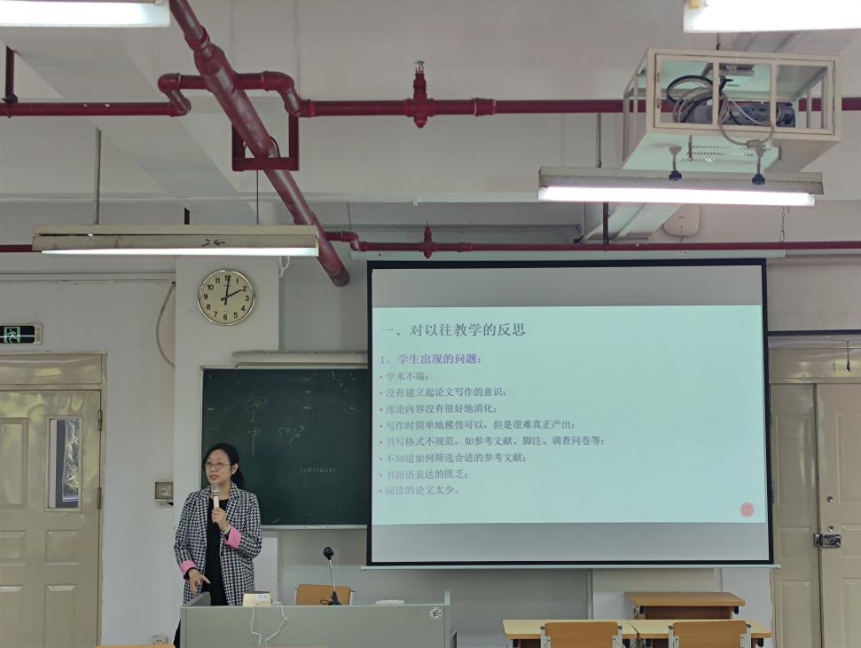 接着,华文教育系田欣儿分享了论文写作课程团队建设经验:在工作模式上,华文教育系的论文写作课形成由了负责人牵头,任课教师联合备课,课程团队统一设计教学大纲、打磨教学课件、共订考核的合作方式,团队内资源共享、互惠共赢;在授课方式上,细分教学专题,由不同教师专门负责讲授;在课程设置上,与大四年级毕业论文开题同时进行,便于理论向实践的直接转化。