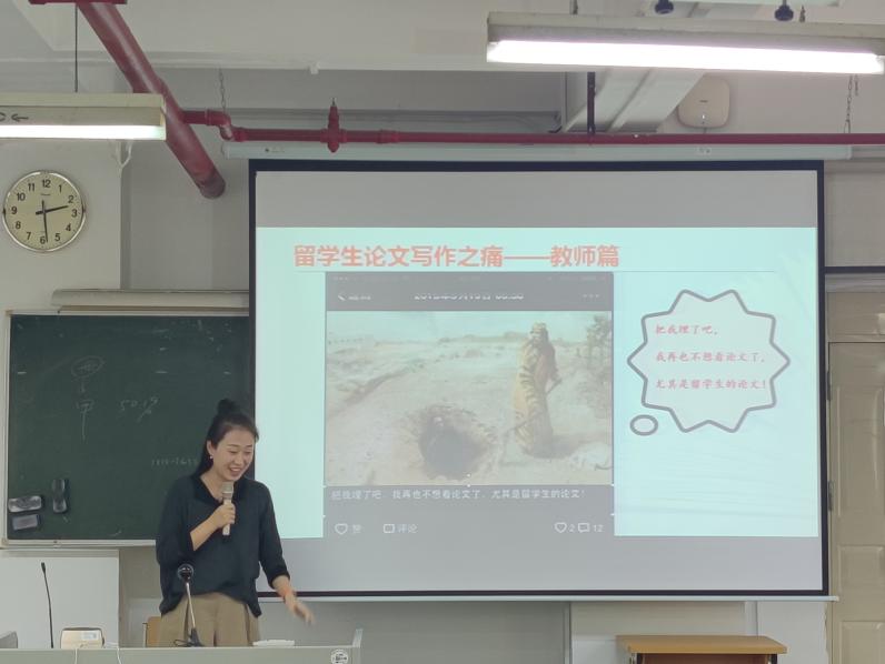 李倩详细介绍论文写作课的课程大纲和教学安排,提出教学瓶颈和学生学习困难,并给出了建议。根据教学情况,她发现学生学习论文写作的最大困难之一在于参考的论文读不懂,转换论文语言的过程太困难。对此,她指出,应当建立适合留学生参考的论文资料库,增开论文阅读课程,为学生掌握学术语言打好基础。