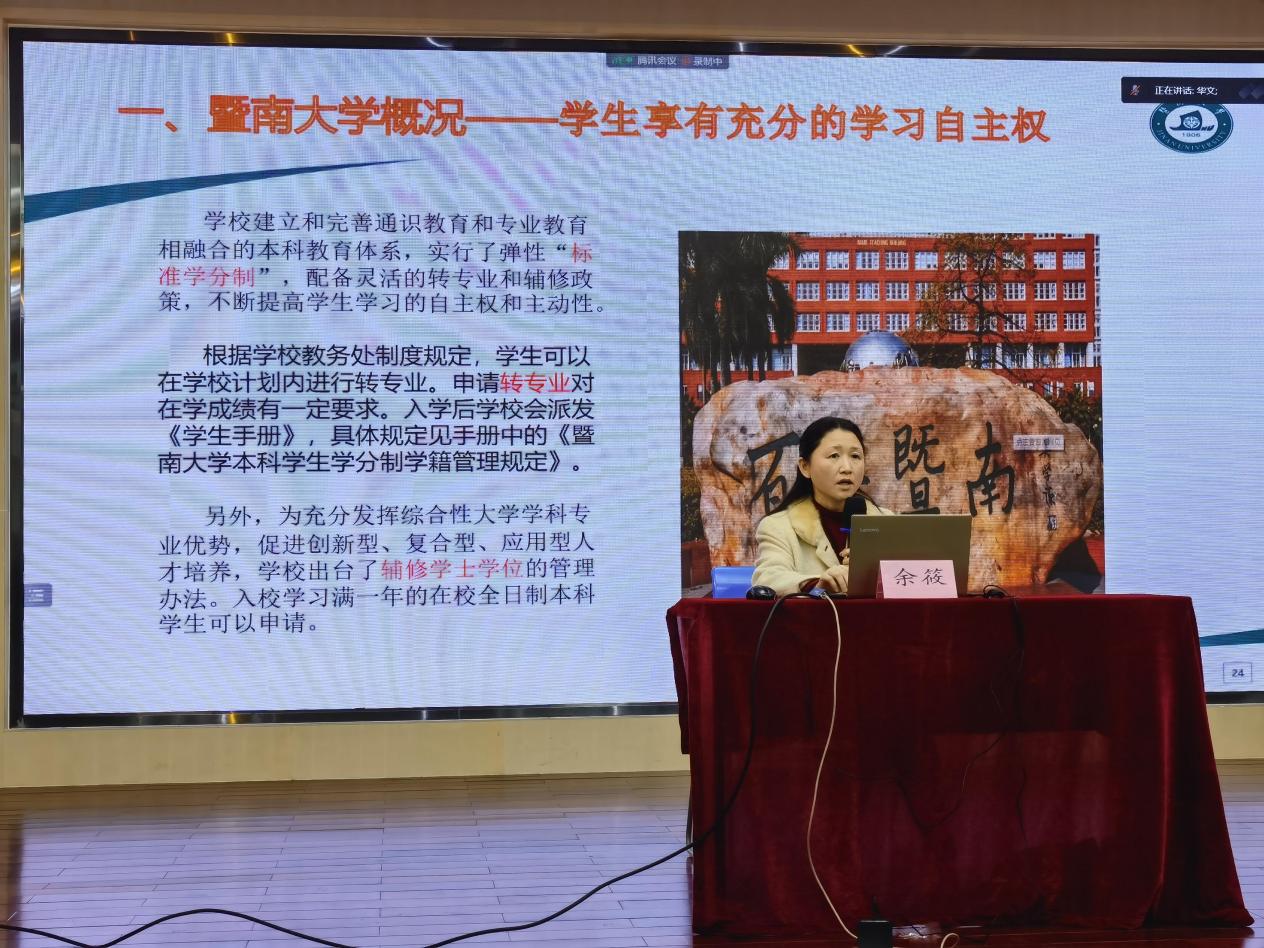 会议伊始,余筱先为同学们介绍了黄色电影 的整体情况,之后从院系设置、名牌专业、发展成果、人才培养、校园生活等几个方面对黄色电影 的情况做了详细介绍。她还具体说明了预科学生的升学途径、相关招生政策及报名时的注意事项,如报名证件有效期问题、两校联招和全国联招有何区别、如何梯度填报志愿、平行志愿的录取规则等,为学生填报志愿提供了充足的信息。