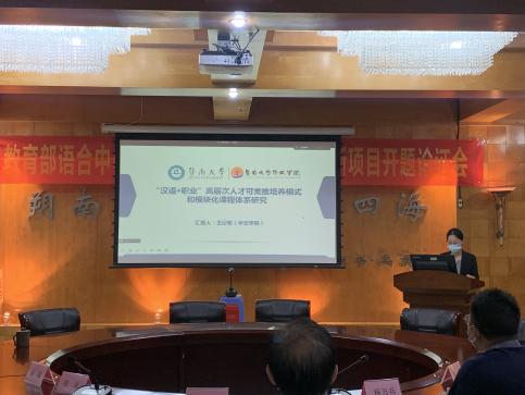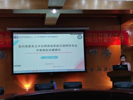 会上,蔡丽、金颖、杨万兵依次介绍各自项目情况,三个项目分别为《面向泰国本土中文师资培养的汉语师范专业中泰高校共建模式》《“汉语+职业”高层次人才可类推培养模式和模块化课程体系研究》和《海外本土国际中文“种子教师”培训的改革与实践》。报告人就项目实施的必要性与意义、实施条件与前期基础、内容与实施计划、主要目标与预期成果以及工作计划进度等方面进行阐述。