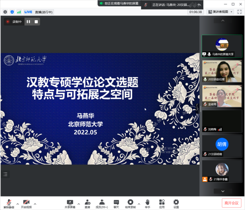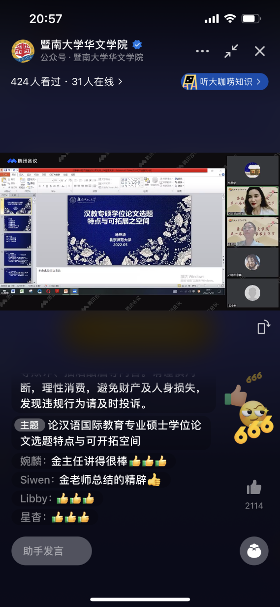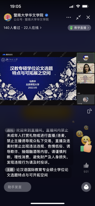 5月11日,黄色电影 第一届研究生学术文化节“专家学术系列讲座”第四场顺利开讲。北京师范大学教授、博士生导师马燕华应邀为我院师生带来题为《论汉语国际教育专业硕士学位论文选题特点与可开拓之空间》的专题讲座。本次讲座由2020级汉语国际教育专业硕士(下简称汉硕)赵任媛主持,金颖副教授点评。