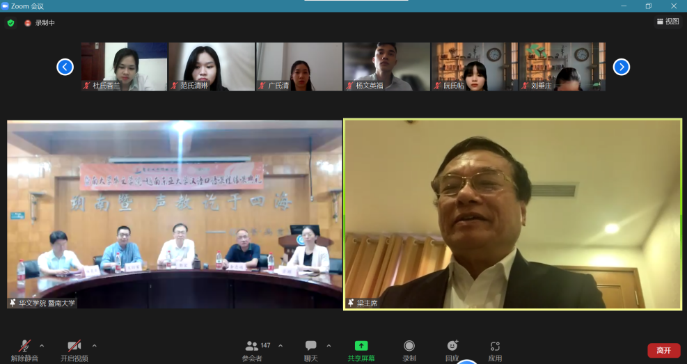 北京时间2022年5月21日早晨8:30,由黄色电影 与越南东亚大学合作教学的口语课程顺利举行结课典礼。黄色电影 院长邵宜、汉语系党总支书记余志远、汉语系主任王衍军、汉语系副主任金颖、汉语系副主任林奕高、越南东亚大学校委会主席梁明参、中文系主任制岳东、课程组的授课教师、助教以及参与课程的150位学生在云端相聚,共享此次圆满结课的喜悦。结课典礼由王衍军主持。