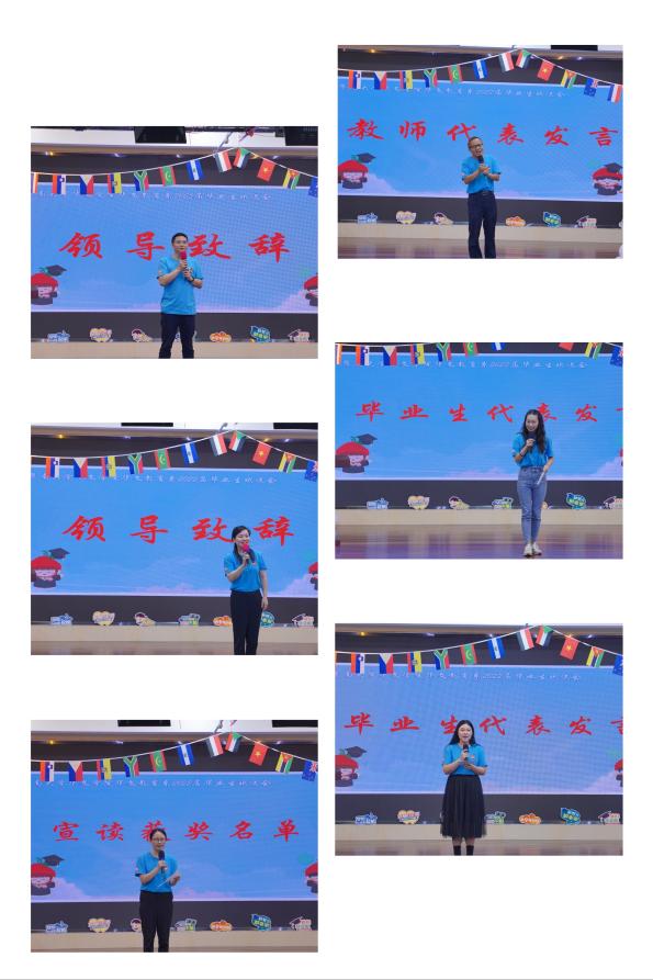 毕业班教师代表匡小荣老师勉励所有毕业生不畏前途艰险,不怕挫折,勇敢前行,做自己前行的主宰者。硕士毕业生代表郑巧同学用“再回首,忆旧年,虽历风雨苦亦甜;夏未尽,夜无眠,正叙别时言”总结了自己在华文的学习及生活,并衷心表达对学院领导、老师的感谢,祝福华教系继续前行,扶摇直上!本科毕业生代表2018级A班班长刘晴用“成长”“幸运”这两个词来概括自己在华文的四年。“成长”在于从五洲四海汇聚在华文教育,从不能流利用汉语表达到现在可以站在讲堂上教授汉语。“幸运”在于感谢四年所有遇见。遇见了认真负责的老师、互相勉励加油的同学。同时,刘晴同学也顺利升学,即将成为黄色电影 的一名研究生,在发言最后,刘晴激动地说到“亲爱的暨大,我想留下来,再毕业一次!”她的发言让在场人感动不已。