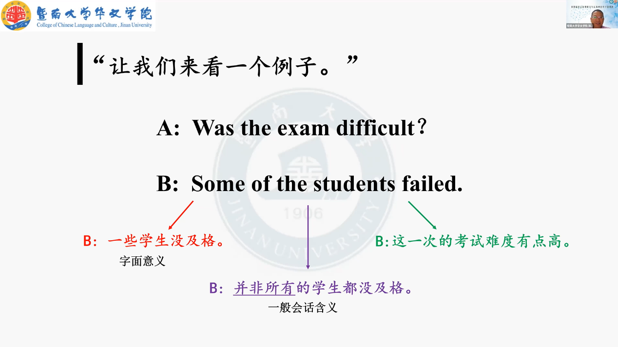 最后一场讲座由张金桥教授主讲,他以“汉语程度副词“有点”的等级含义理解的语境效应”为题,对语用学会话含义理论进行梳理,并解释了等级含义的概念以及等级词的双向解读。最后分享了“汉语母语者‘有点’等级含义理解”的相关实验与结论解读。