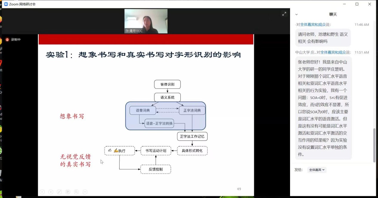 接着,张清芳以“汉语书写产生过程的认知和神经机制:行为和脑电研究”为题,阐述汉字书写产生过程、书写中正字法和语音激活的认知神经机制、书写运动参与汉字字形识别的认知神经机制的相关研究。