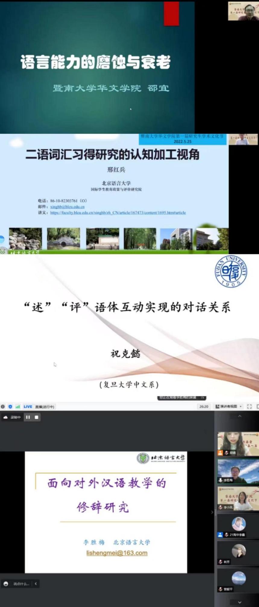 2022年4月7日至6月8日,学术文化节共开展专家学术讲座8场,讲座内容涵盖汉语二语习得与认知研究、国际中文教育、语体学和修辞学等方向。北京语言大学王建勤教授和邢红兵教授开拓了我们对二语习得这一研究领域的认知,黄色电影 的邵宜教授从横向与纵向两个角度,深入浅出地分析了语言能力的磨蚀与衰老,为聆听讲座的师生塑造了语言大局观、启发了研究思路。黄色电影 的郭熙教授、华东师范大学的吴勇毅教授和北京师范大学马燕华教授分别论述了海外华语传承的转向与路径、《国际中文教育中文水平等级标准》制定的准确性与科学性、汉硕学位论文的可开拓之选题。复旦大学的祝克懿教授将对话理论与互文性理论相结合,多方位多层次地阐述了对话理论、互文性理论的缘起及发展;北京语言大学李胜梅教授强调了对外汉语教学中的广义修辞观,并从教学实例出发揭示了对外汉语修辞研究的10个主要方面。