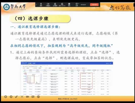 23日上午,教务员吴敏玲老师为同学们全面、透彻地介绍了华文教育专业2021级人才培养方案。吴老师向新生们详细展示了登录教务系统的方法及正确的选课步骤,介绍了通识选修课的类别,并强调了选课的注意事项,建议大家根据培养方案按班选课。在说明会尾声时,吴敏玲就同学们提出的各种疑问进行了详细解答。