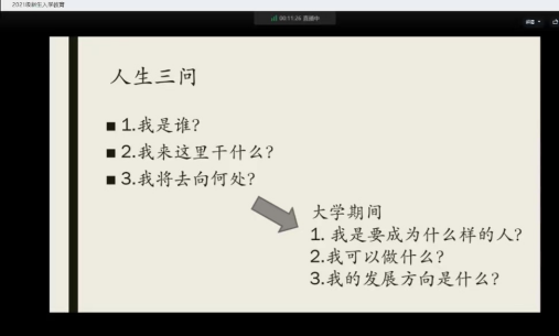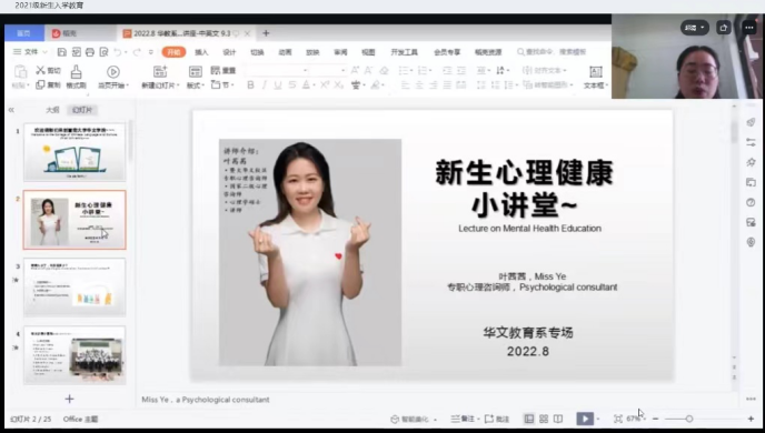 25日下午的心理分享会由叶茜茜老师主讲。叶茜茜向新生们讲述了一些常见的心理问题,以及如何处理这些心理问题的渠道与方法。叶茜茜还向同学们提供了一些培养心理健康的小妙招:第一,了解自己;第二,接纳自己;第三,懂得求助。在分享会过程中,叶茜茜还组织同学们进行了在线互动游戏,例如写出20个“我是谁”,写“致一年后的自己”等等,同学们积极参与,乐在其中。