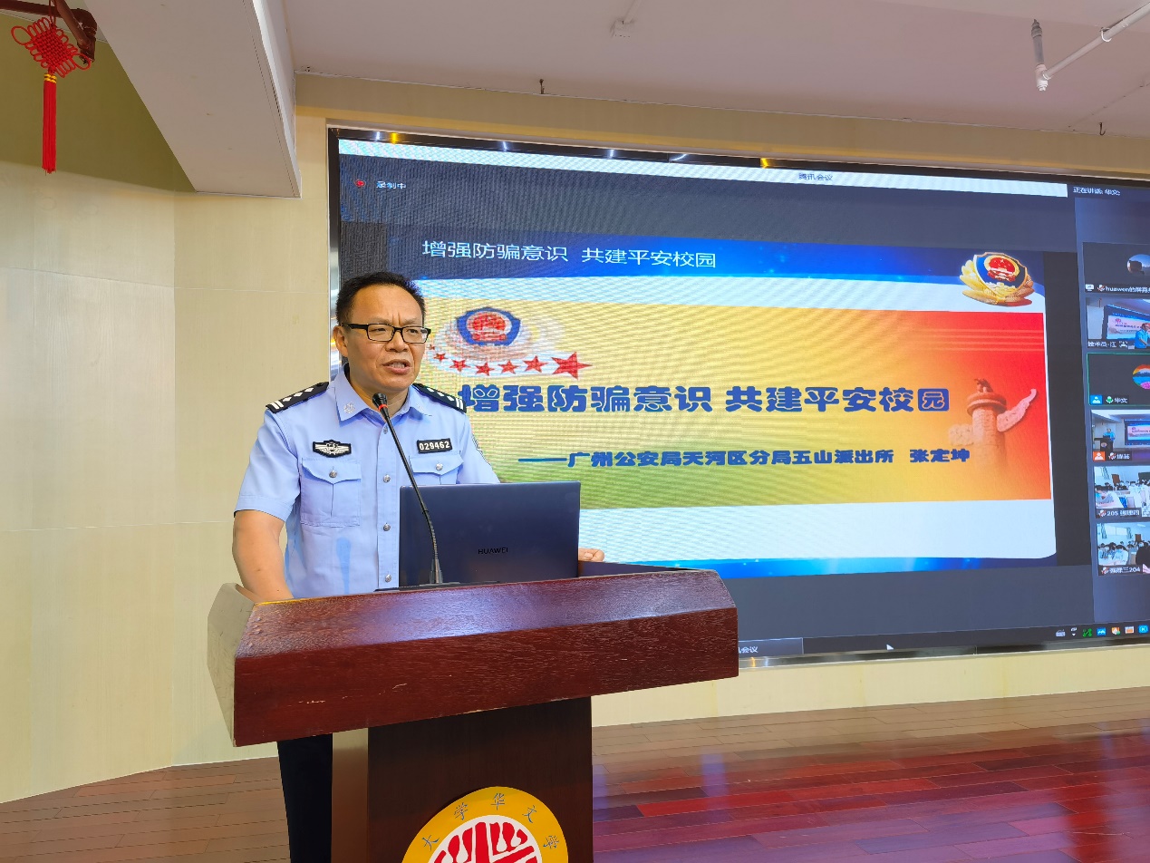紧接着,广州公安局天河区分局五山派出所张定坤警官主讲反诈防骗安全教育讲座,张警官重点讲解包括网络贷款诈骗、刷单返利诈骗、冒充电商物流客服诈骗、冒充“公检法”诈骗、虚拟购物诈骗、不良信息链接诈骗等多种诈骗套路;着重分析了每一种套路的易受骗群体、作案手段、诈骗心理。通过真实发生的案例加深同学们对不同骗术的理解,并提醒同学们保护好个人隐私,不轻易相信各类诈骗信息,遇到各种骗局做到“不理睬、不轻信、不转帐、不汇款”,增强反诈防骗意识,确保人身财产安全。