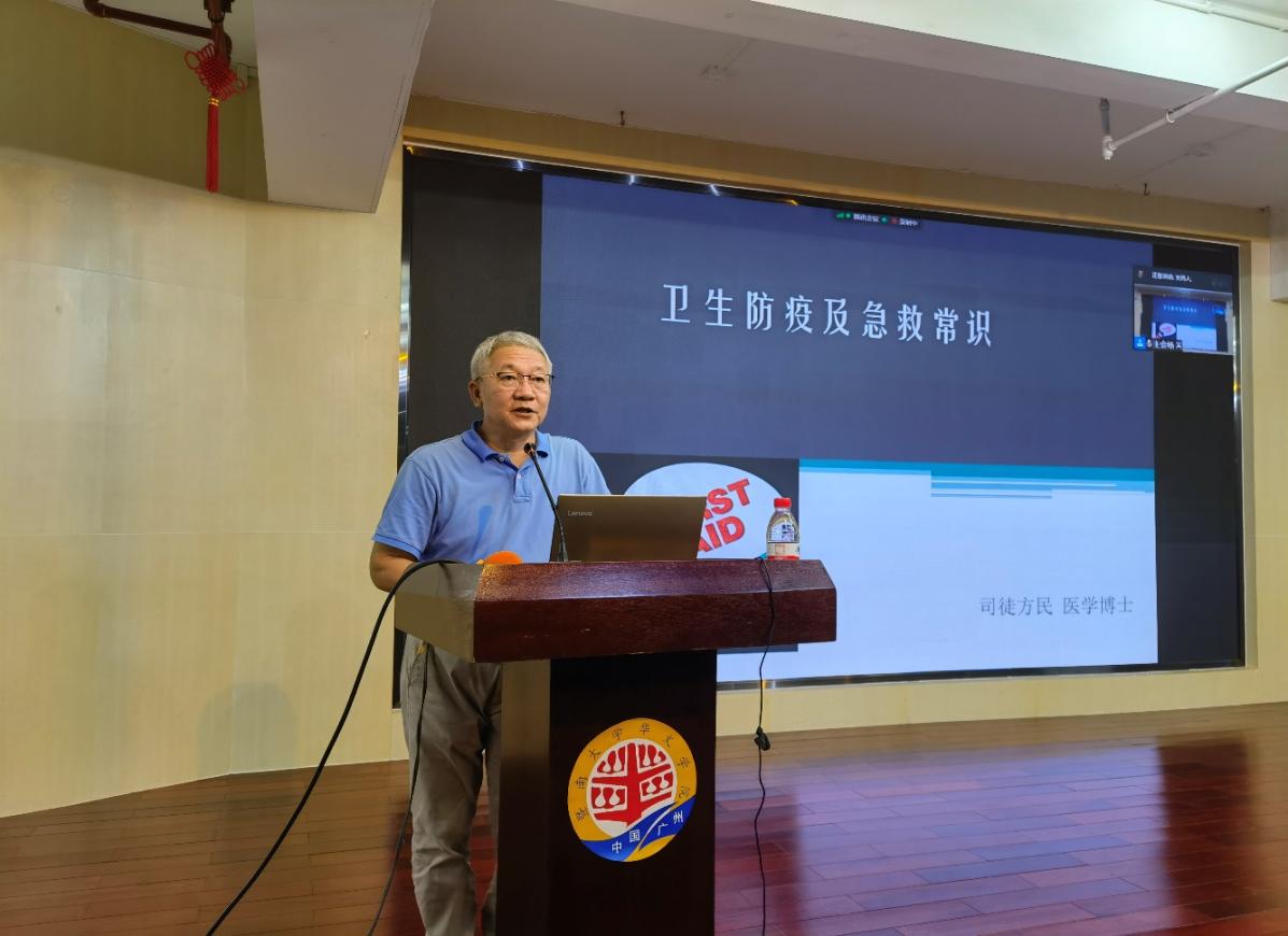 随后,学院医务室主任司徒方民主讲卫生安全和防疫知识,通过介绍卫生防疫的基本知识、新冠病毒的主要传播途径及如何日常预防新冠病毒,如何做好个人防护等知识,帮助学生树牢防护意识,以正确的心态面对疫情,养成讲卫生的良好习惯。他还提醒同学们要“勤通风、晒衣被、洗净手、吃熟食、喝开水”,多注意个人卫生以及宿舍、教室等场所的卫生,加强体育锻炼,增强免疫力。