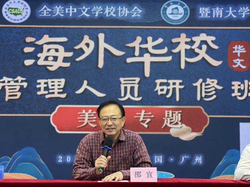 邵宜院长致欢迎辞。 他强调,本次研修活动是继“马来西亚华校治理专场分享会”之后第二个以国别专题开设的研修班。美国华文教育体量大、水平高、历史久,对当地华裔子弟的中文和中华文化学习贡献卓著。本次研修班任课教师以美国中文学校知名校长、资深教师为主体,均为来自华文教育一线的业界精英,教学、管理经验丰富,且有独到的经验、体会和感受,对全球华文教育来说是值得借鉴的宝贵财富。相信通过大家共同的努力,一个月的研修一定能够让来自各国的华校管理层学有所获,深受启发!