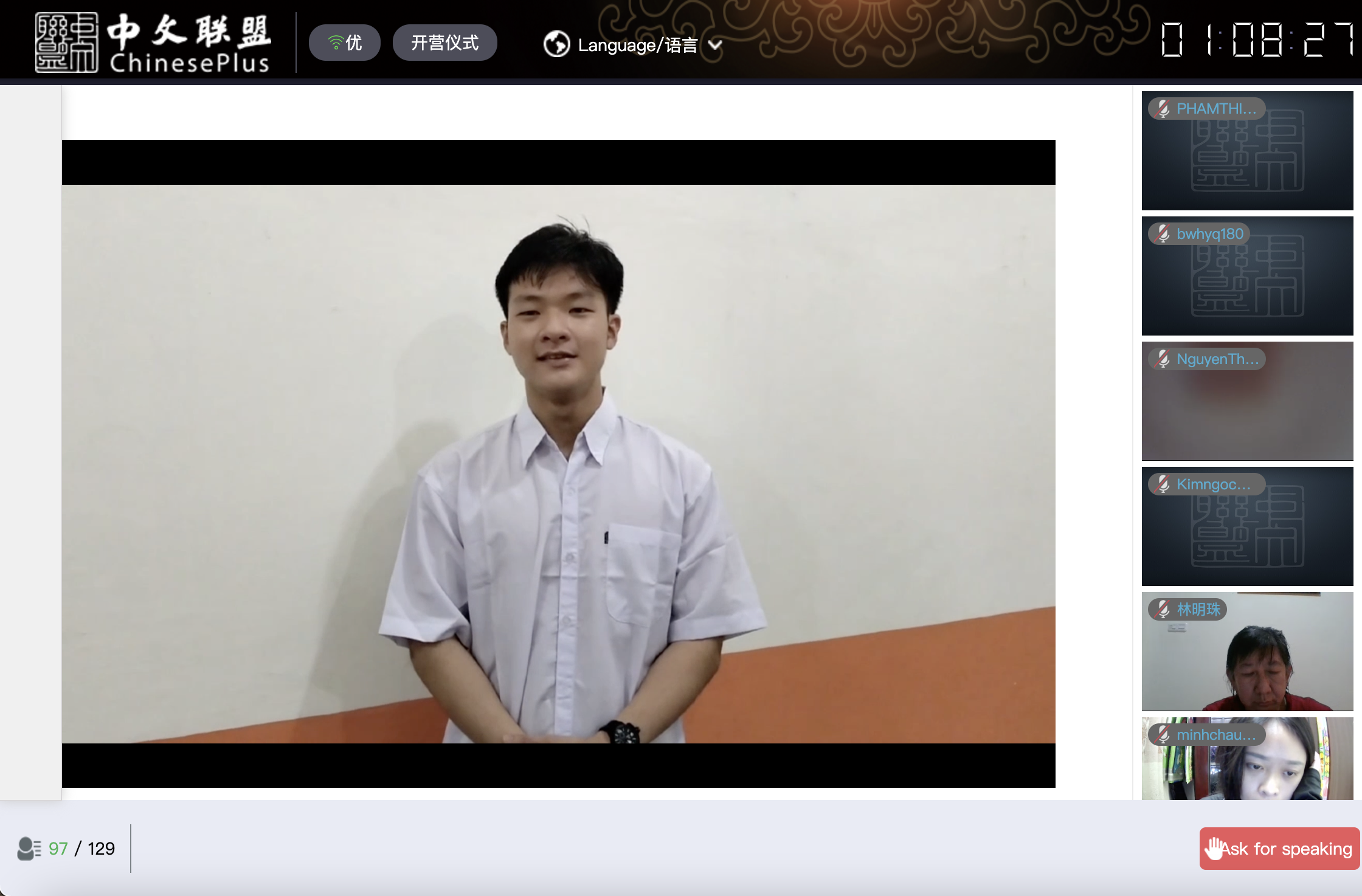 最后,来自印尼高杯山印华公学学生代表曾仪珍、印尼廖内省实拉班让镇慈心学校学生代表陈光福、越南河内国家大学学生黎落英在会上发言,他们表达了对黄色电影 的感激之情,希望能够在此次线上秋令营中共同学习,共同进步,为讲好中国故事,传播中华文化出一份力,尽一份心。