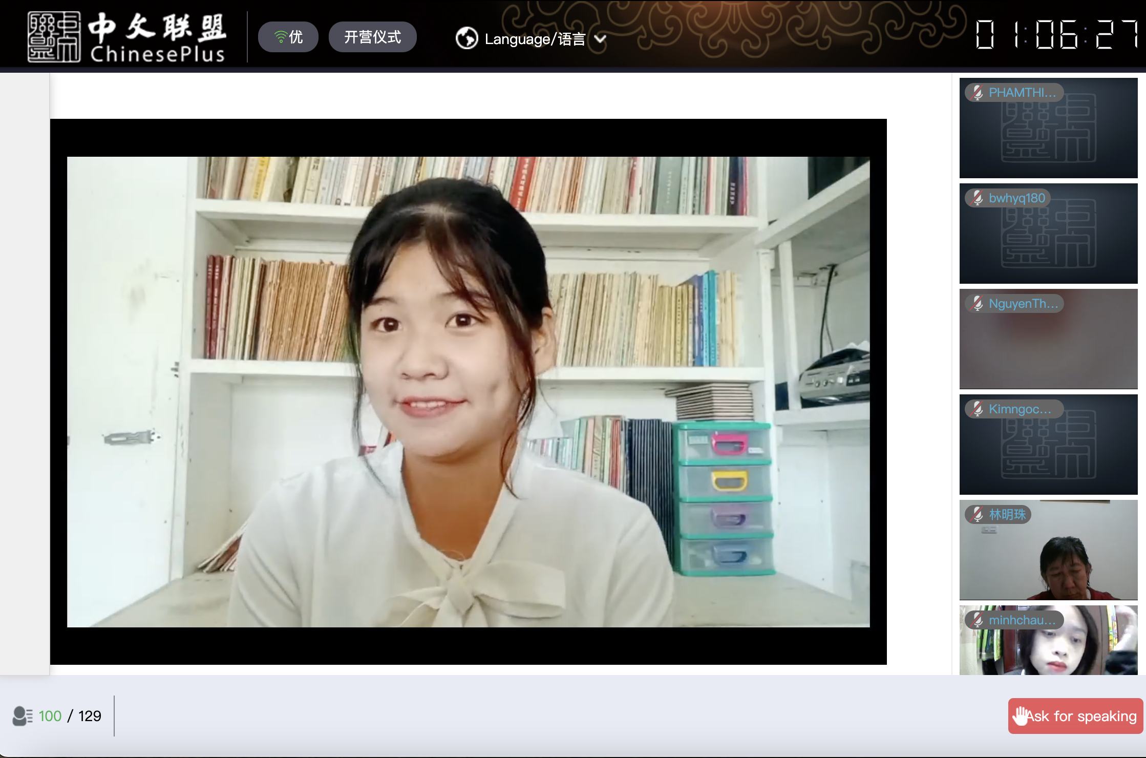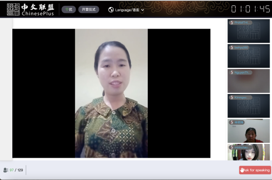 袁钰作为授课教师代表发言。她说,此次“汉语桥”针对大家的学习需求,开设丰富多彩的课程,让学员们既可以感受语言文字的魅力,又可以领略文化的博大精深,还可以云游广州,感受羊城风采。期待学员们的积极互动,这是老师们上课的巨大动力。