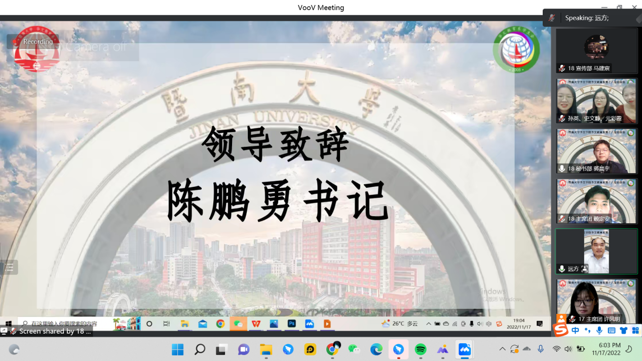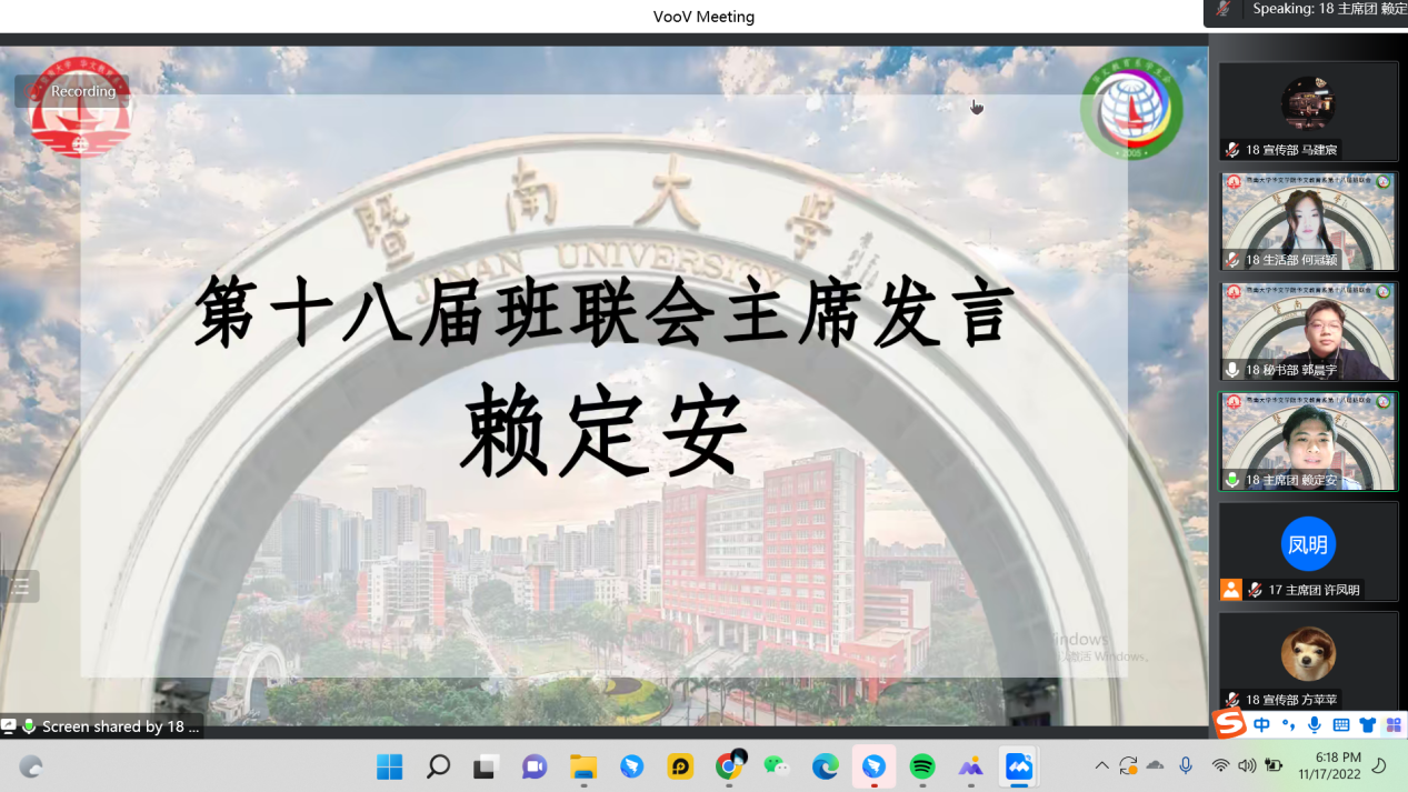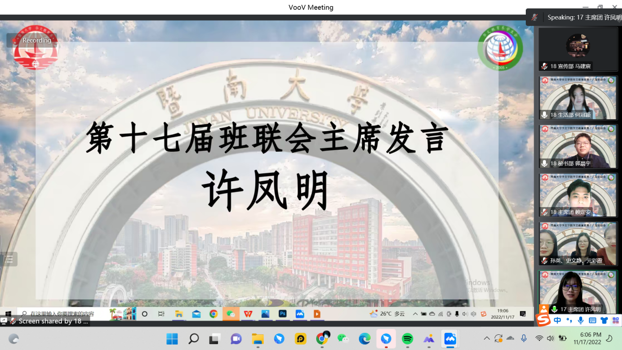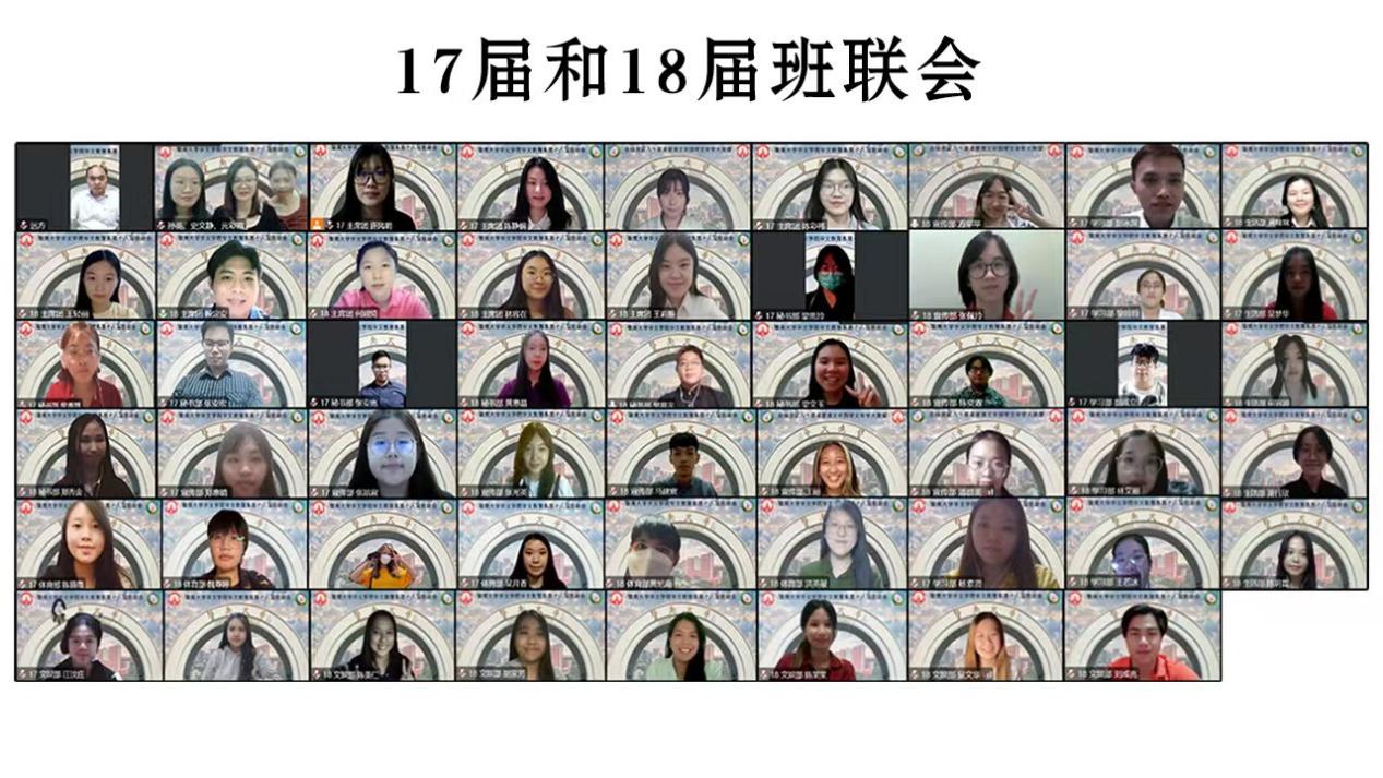 华文教育系第十七届班联会换届大会如期而来。2022年11月18日晚19:00,第十七届班联会换届大会通过线上会议方式举行,全体成员相聚云端,齐心分享。出席本次换届大会的有华文教育系党总支陈鹏勇书记、辅导员孙英老师、史文静老师、元彩霞老师以及第十七届和第十八届班联会成员。