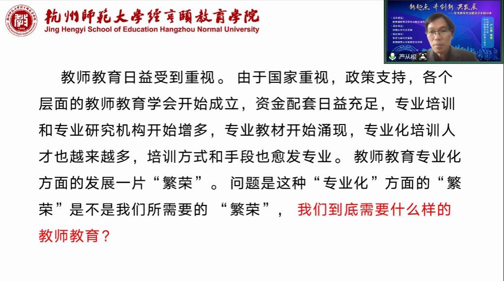 另外,严教授还着重强调了阅读经典的重要性,阅读经典对培养教师和学生良好的职业素养和人文情怀具有重要意义。并以杭州师范大学自身的课程设置为例,为与会者提供了如何寻求教师教育的途径和探寻的实例。