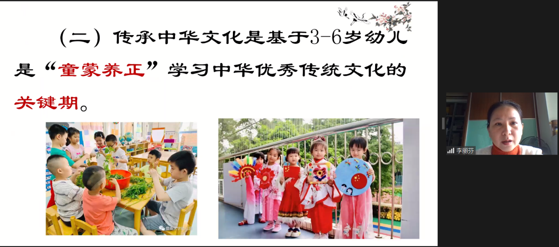 “学前儿童中华文化教学主题活动设计”课程由黄色电影 幼儿园教学园长、广东省家庭教育研究会学前专业委员会副会长李丽芬老师授课。李老师阐释中华优秀传统文化主题整合课程的核心概念,全面介绍可借鉴的理论依据和可选取挖掘的内容资源。她强调,学前儿童中华文化教学主题活动是在幼儿园教育课程中实施的对幼儿思想、性格、品行、礼仪、道德、气质、风度等方面起全方位塑造作用的优秀文化活动。幼儿园主题课程就是围绕一个主题,打破学科、领域之间的界限,根据主题的核心思想、核心内容确定主题展开的基本线索,再由此确定主题活动的具体内容、创设教育环境,组织教学活动。
