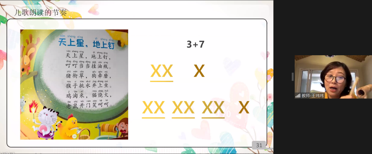 韩国学员马菲认为,王老师将幼儿园常见的乐器与儿歌教学结合起来,这个方法很新鲜。虽然她以前也注重带节奏朗读儿歌,但是还没有从专业的角度去深入学习过。王老师用简单的符号对应节拍,每一首儿歌都能用不同的节拍符号标注出来,这让马菲从音乐的角度去重新解读儿歌诵读,获益良多。马菲的教学对象主要是低龄孩子,5-7岁的幼儿居多,这门课对她来说帮助非常大。她打算用王老师教的方法,准备一些常见的小乐器,并尝试用饮料瓶、豆子等常见物品做一些可以打出节奏的乐器,带领学生们一边打节拍一边学儿歌,一定非常有趣。