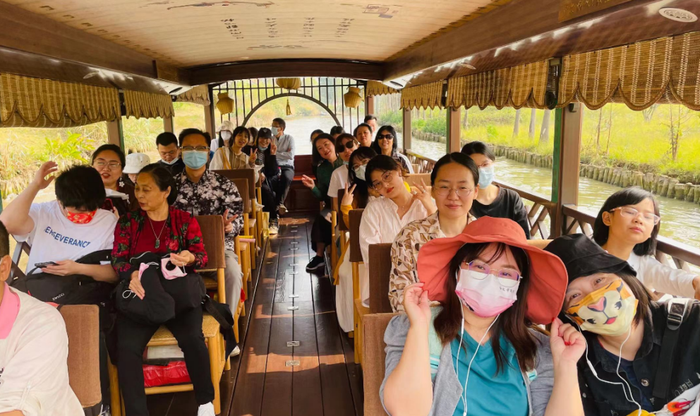 踏青第一站,大家到达古劳水乡,领略岭南水道风光与商道文化。乘船环游水乡时,满园深浅色,照在绿波中,令人心旷神怡。在游船过程中,老师们热情高歌,现场一片欢声笑语,气氛活跃。体验完游船项目后,大家三两结伴打卡水乡内的特色景点,体验当地传统美食与艺术项目。