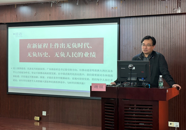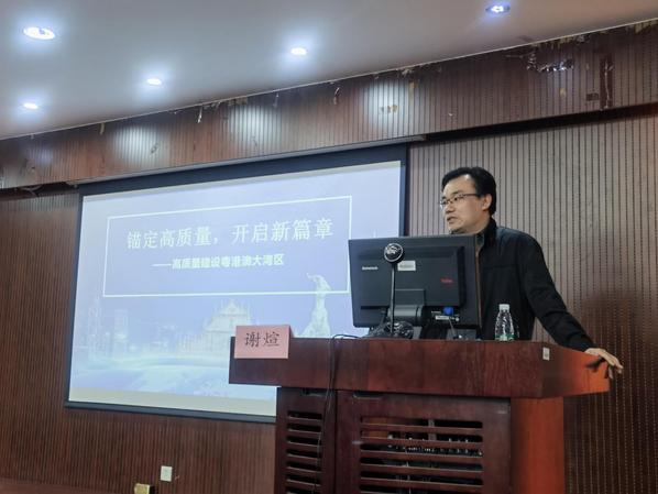谢煊主要从高质量发展推动中国式现代化、粤港澳大湾区高质量建设情况、湾区建设给港澳青年带来的发展机遇三个方面进行讲授。课上,他结合党中央关于粤港澳地区高质量发展的重要指示精神,详细介绍了高质量建设粤港澳大湾区的概况、湾区发展对推动中国式现代化的重大意义。他重点指出,高质量发展作为全面建设社会主义现代化国家的首要任务,实现高质量发展是中国式现代化的本质要求之一。粤港澳大湾区作为国家开放程度最高、经济活力最强的区域之一,以高质量发展为战略部署,不仅能为广东奋进新征程、建功新时代指明前进方向,还能为实现中华民族伟大复兴更好发挥作用。同时,高质量建设粤港澳大湾区,既是新时代推动形成全面开放新格局的新尝试,也是推动“一国两制”事业发展的新实践,对深化内地和港澳交流合作,推动港澳参与国家发展规划,保持长期繁荣稳定具有战略意义。