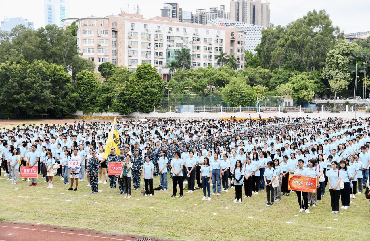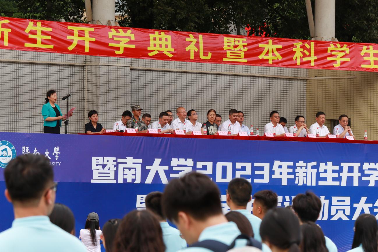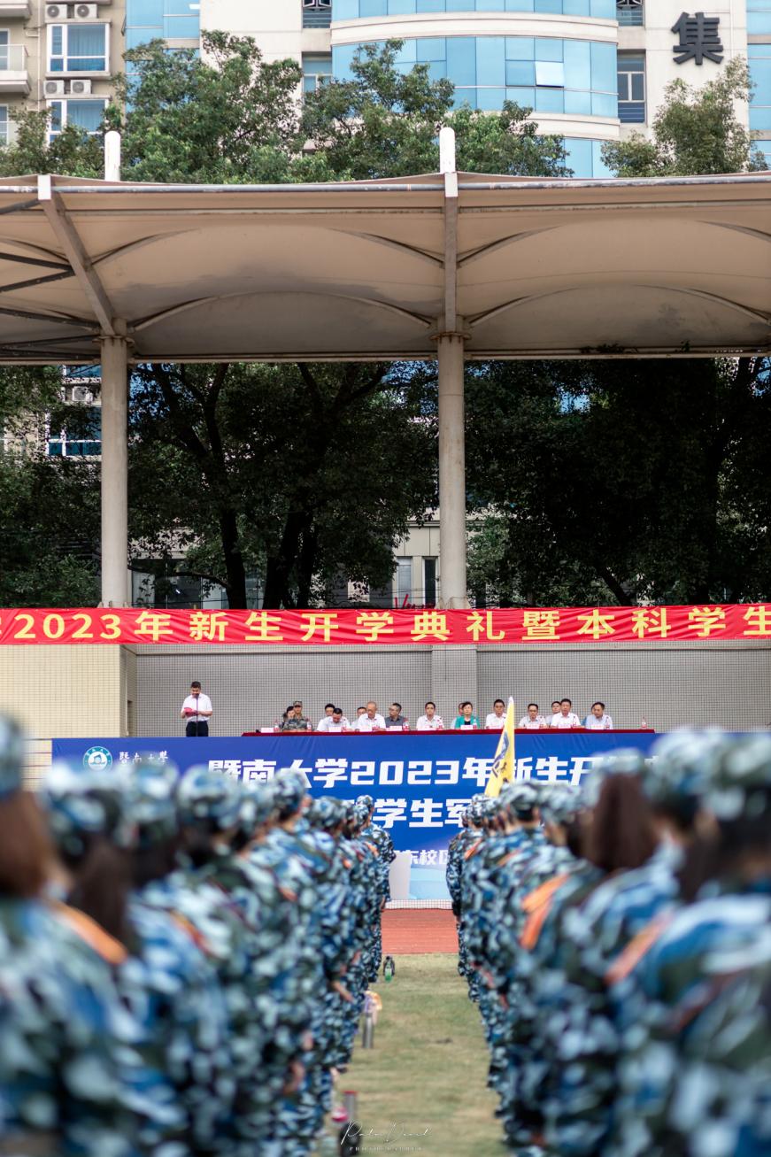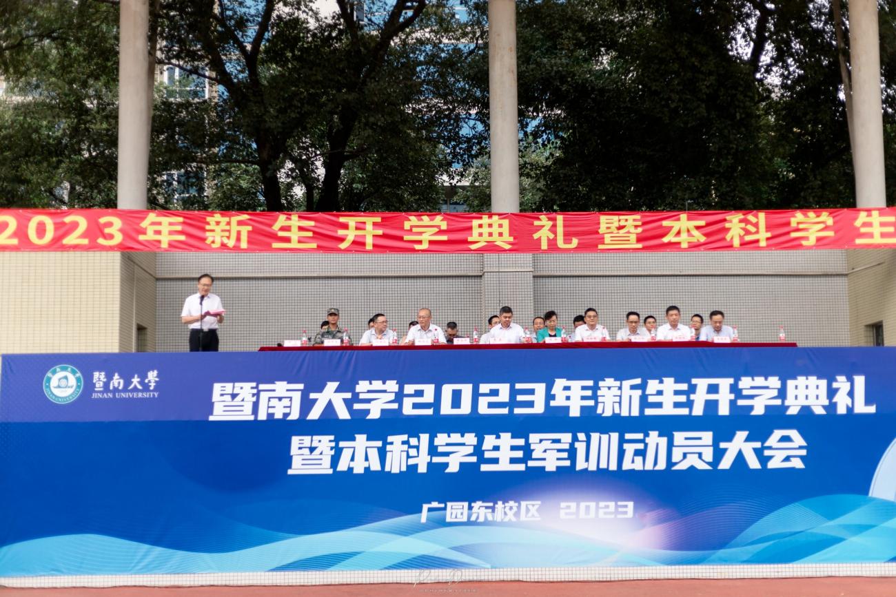 开学典礼上,举行了本科生军训动员大会,夏泉向军训连授旗,邵宜宣读军训师编制。饶敏指出,在入学之初开展军训,目的是希望同学们学习军队优良传统,培养艰苦奋斗精神、纪律意识和集体主义观念,牢固树立国防意识和爱国主义精神。她向新生们提出了三点希望与要求:一是胸怀家国,做立志高远的追梦者。充分认识到国防教育的重大意义,在思想上高度重视,在行动上积极投入,踔厉奋发、勇毅前进,为新时代中国国防和中国式现代化建设写下暨南学子的青春注解。二是严守纪律,做严于律己的示范者。以军人的姿态来塑造自己,以军人的标准来要求自己,以军人的纪律来约束自己。同时,做好自己身体健康的第一责任人,注意饮食和休息。三是吃苦耐劳,做脚踏实地的奋斗者。希望同学们认真完成本次军训的各项任务,践行“请党放心,强国有我”的铿锵誓言,向祖国和人民、向学校和学院、向自己交上一份满意的答卷。