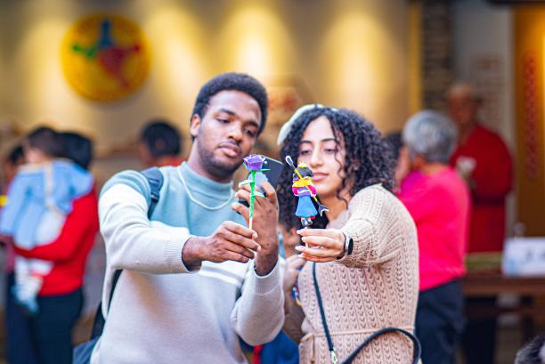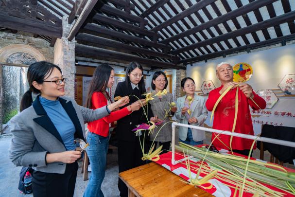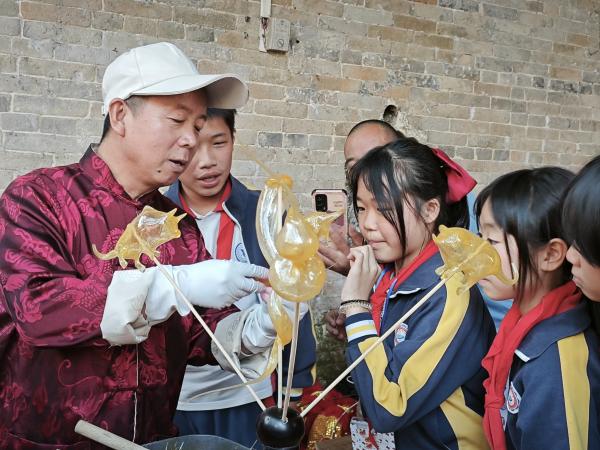祠堂文化节现场特设了手指画、剪纸、中国书法、捏面人、吹糖人、草编6个非遗展位。孩子们和我院30多名留学生一道参与制作体验,分享品味中华文化的经典魅力,欢笑声、欢呼声、惊叹声不绝于耳。孩子们与留学生大哥哥大姐姐们用汉语和英语进行简单对话,现场气氛热烈,欢快祥和,多元与经典的语言文化和谐交流交融,大家流连忘返,纷纷留下联系方式,相约下次再见。