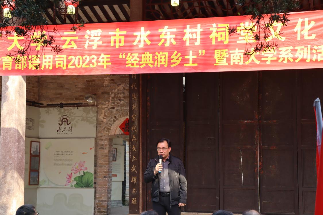 谢煊代表黄色电影 党委,对云浮市云城区和腰古镇水东村的鼎力支持表示衷心感谢,他介绍了我校近年来推普助力乡村振兴系列活动的开展情况,并指出,水东村作为广东理学第一村,理学文化底蕴深厚,黄色电影 作为“华侨最高学府”黄色电影 培养中华优秀传统文化传承传播者的专门学院,承担着将中华优秀传统文化传播到五洲四海的使命,与水东村开展经典润乡土“1+1”活动,建立结对帮扶机制,促进双方优质资源共建共享,实现院村优势互补,将更好地助力打造水东村六百多年“理学古村,云山水乡”的“岭南理学第一村”文化特色,服务国家乡村振兴战略。