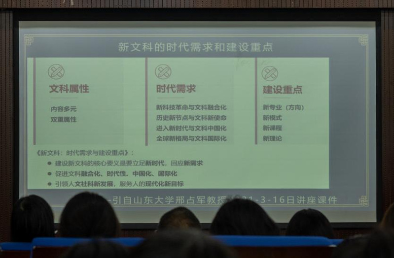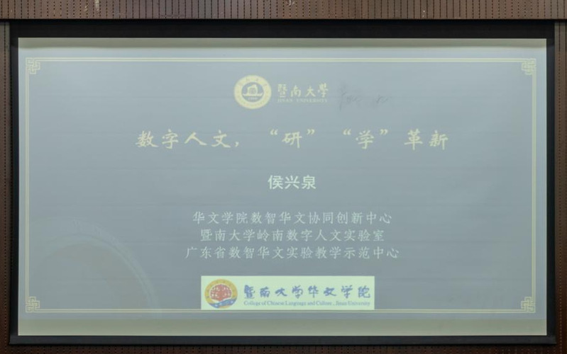 侯兴泉在授课中介绍道,目前,我国已将数字化和智能化提升到国家战略高度。他首先从宏观政策切入,介绍了在数智时代人文学科日益清晰的改革图景,强调要以深入建设新文科为破局点,加快文科教育的创新发展。随后,侯兴泉向同学们展示学院的应对之策:一是成立“数智华文协同创新中心”;二是在《华文教学与研究》开设“数智华文”研究专栏;三是为本硕博学生开展“数字人文”相关课程。