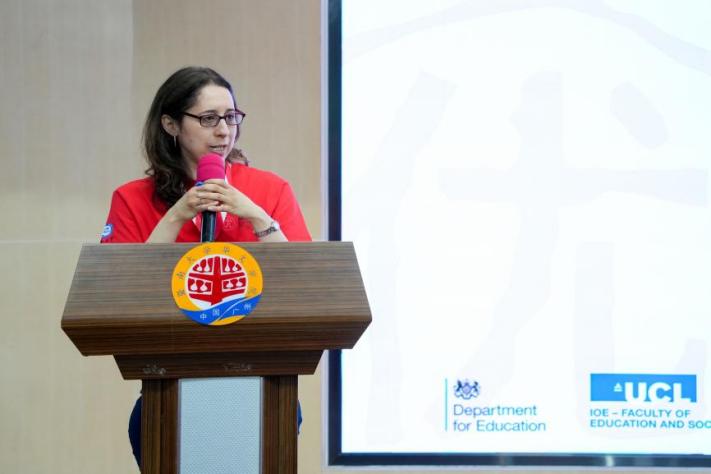 英国校方带队老师Andreou Natasha在发言中对我校给予的热烈欢迎表达了诚挚的感谢。她表示,来自两国的老师、同学们汇聚于此,为同一个目标付出巨大努力,实属难得的经历。学生们充满期待,将借此宝贵机会,学习中文、了解广州、深入理解中华文化。