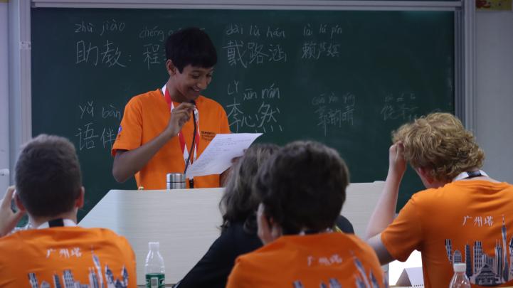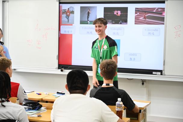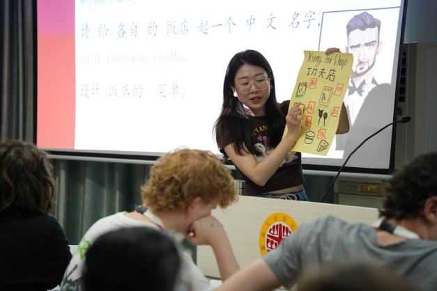 小班语言基础课主要开设汉语乐园、趣味汉字、诗歌中国、岭南文化大讲堂等课程,以故事主线串联课程内容和互动游戏,包含了爱好、购物、中餐、节日、运动等实用主题,巧妙地设置情景,操练词汇和语言点。英国学员和中文志愿者组成团队,合作完成“比划猜词”、“按铃速答”、“小组辩论”、“词语剧场”等形式多样、难度梯度清晰的活动任务和游戏,从听、说、读、写四个方面培养学员的中文综合技能。课堂上亲和活泼的教学风格消融了师生间的距离感,快速增进了老师与学员、学员与中文志愿者之间的了解和信任。