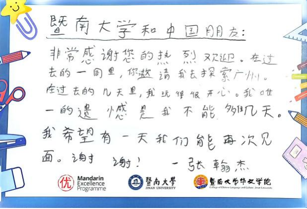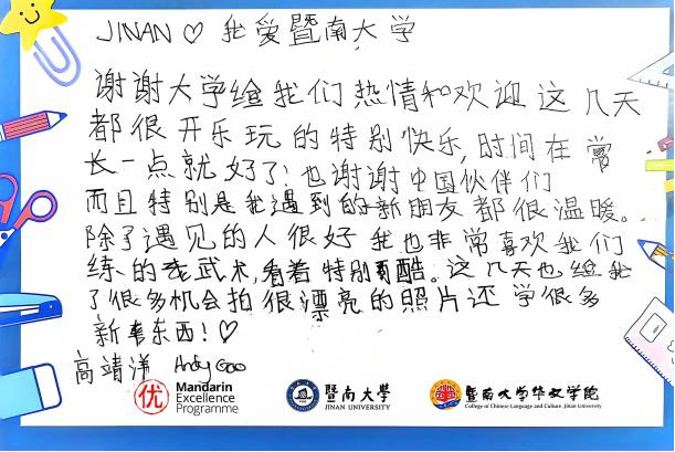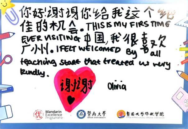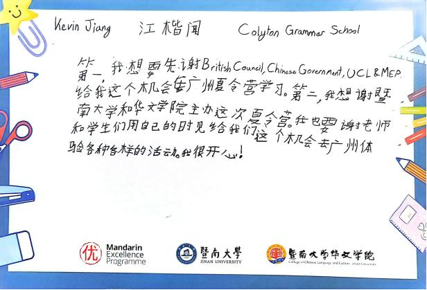 “学习新的中文词语、尝试体验新事物,在广州的每一天都有新的惊喜。”“最厉害的是,我们去了李小龙的故居!”对于很多学员来说,本次夏令营的经历让他们终身难忘。来自Fortismere School的Meave Curry表示:“在广州,我第一次和那么多中国人交流,得到了很多练习中文的机会,也得到了很多鼓励,我对自己的口语更有自信了。”来自Colyton Grammar School的Justin Shin说:“我的爱好是唱歌,学习中文之后,我发现中文跟音乐一样漂亮,深深吸引着我。”来自St-Ignatius College学校的Adam Mati最喜欢喝茶,他说:“一喝中国茶,我就一定能想起在黄色电影 的这段快乐的日子,我们在这儿受到了热情的欢迎和款待,认识了有趣的中国朋友。”离别之际,不少学员用小卡片传递感谢和不舍,表达努力学好中文,早日重返中国的愿望,纸短情长,字字暖心。