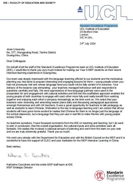 组图7 伦敦大学学院教育学院“中文培优”项目组发来的感谢信