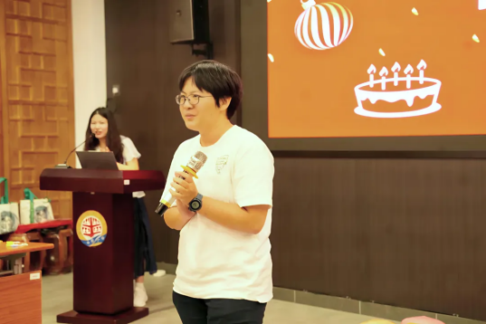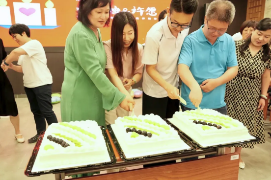 伴随着《生日快乐》的欢快旋律和全场热烈的掌声,寿星老师们欣喜愉悦地走向会场中央,围着生日蛋糕共同许下属于自己的生日愿望。