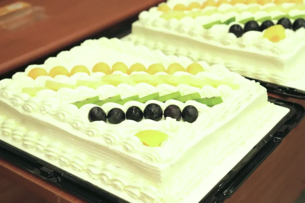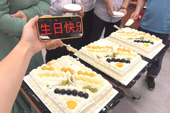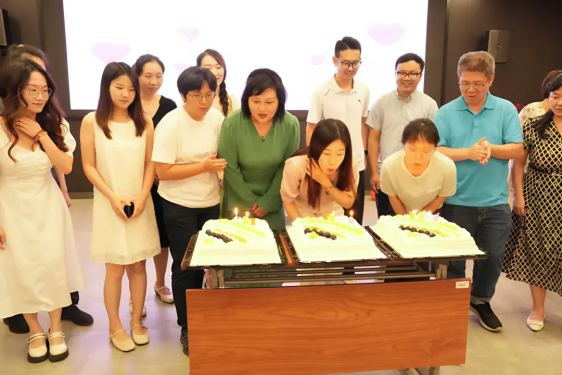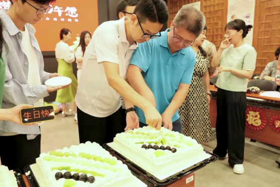 摇曳的烛光映照着他们幸福的脸庞,在大家的祝福声中,寿星老师们俯身吹灭蜡烛,共同切开了装饰精美的生日蛋糕。随后,他们亲手将切好的蛋糕分发给在场的每一位领导老师,香甜的奶油与真挚的祝福在会场中传递,现场氛围十分温馨。
