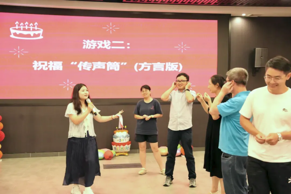在“祝福传声筒”环节,老师们操着独特的乡音传递方言祝福,出人意料的发音让全场忍俊不禁。伴随着此起彼伏的笑声和掌声,团队的默契与欢乐在游戏中不断升温,老师们脸上洋溢的笑容,为这个特别的生日会增添了更多乐趣与活力。